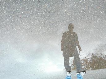 Keywords: reflection puddle outdoor blue asphalt clouds silhouette weather wet ground girl female rain sky