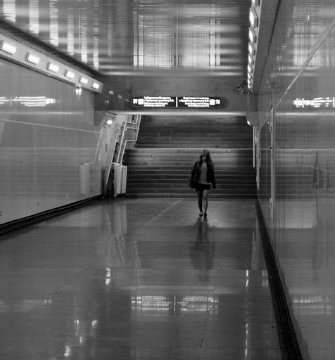 Keywords: underground girl metro passage reflections blackandwhite monochrome black and white OM Zuiko 35mm shift OM Zuiko 35mm shift