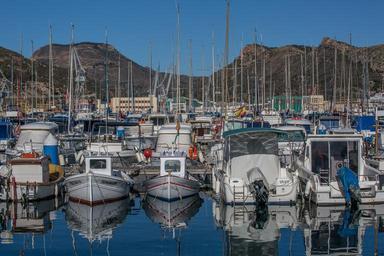 Keywords: reflections boats water summer blue calm harbor reflect tranquil landscape