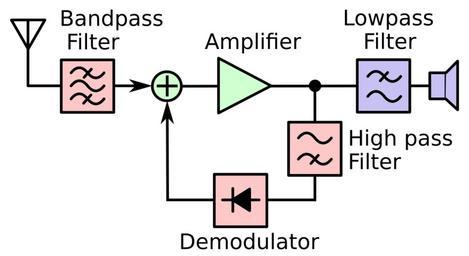 | Keywords: Reflex receiver block diagram.svg reflex radio receiver an unusual type of radio receiver invented by Marius Latour and William Preiss in 1917 that was used to a limited extent in the 1920s The distinguishing feature of the reflex circuit is that the amplifier is used to amplify both the radio frequency RF and audio frequency AF signals at the same time It functions as a tuned radio frequency TRF receiver The RF signal from the antenna after passing through the bandpass filter a tuned circuit which selects the frequency of the station desired passes through an amplifier consisting of one or more vacuum tubes or transistors then passes through the high pass filter to the demodulator which extracts the information bearing modulation audio signal from the radio carrier wave This is fed back and passes through the same amplifier again which does the audio amplification passes through the lowpass filter which blocks the RF signal and is applied to the speaker Thus the amplifying devices do double duty reducing the number of active devices needed The economical reflex circuit was used in inexpensive single vacuum tube receivers in the early 1920s but feedback problems limited its usefulness 2016-01-07 own Chetvorno other versions cc-zero Receivers Uploaded with UploadWizard Reflex receiver circuits |