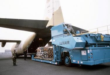 | Keywords: Reforger 90 C-130E Hercules Lux Apt DF-ST-91-00048.jpg Pallets of cargo await loading aboard a 435th Tactical Airlift Wing C-130E Hercules aircraft at Luxembourg International Airport in preparation for transportation to West Germany during exercise REFORGER '90 The plane is being loaded while its engines continue to run engine running onload a process which promotes rapid deployment of cargo and personnel 1990-01-07 http //www defenseimagery mil/imagery html;jsessionid 1E8D60B597B0147A7841E405BE5D755C a search s 20DF-ST-91-00048 chk 6cfe0 guid 37ce50a0f700a9ebad38929845c8c3bb613401d9 www defenseimagery mil VIRIN DF-ST-91-00048 Master Sergeant Bill Thompson USAF PD-USGov REFORGER 1990 Military aircraft at Luxembourg-Findel International Airport C-130E Hercules United States Air Force Uploaded with VicuñaUploader |