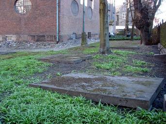 Keywords: Reformerte Kirkes kirkegård.JPG Del af Den Reformerte Kirkes kirkegård med urtegården og monument over Olfert Fischer i baggrunden København own 2012-03 Orf3us Reformert Kirke København