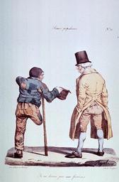 | Keywords: Refusing a beggar with one leg and a crutch.jpg An amputee beggar holds out his hat to a well dressed man who is standing with his hands in his pockets Artist's caption's translation I don't give to idlers http //ihm nlm nih gov/luna/servlet/view/all/what/Amputees this webpage in the collection of http //ihm nlm nih gov/ Images from the History of Medicine which is a library of the U S government's http //nih gov National Institutes of Health Caricature by Edmé Jean Pigal 1798-1872 ; lithograph by Langlumé; published by Gihaut et Martinet PD-old-70 Joseph Langlumé Amputees in art Challenges to physical balance Crutches in art Patches Disabled beggars in art People with mobility impairment in art |