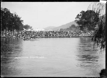 | Keywords: blackandwhite monochrome outdoor water photo border watercourse lake landscape black and white Regatta on the Waikato River at Ngaruawahia, circa 1910. Across the river marquees are visible, with crowds of people lining the river bank. There are several motor boats beside the bank, and one laden with passengers. Photograph taken by William Archer Price. Inscriptions: Inscribed - Photographer's title on negative -bottom left: Ngaruawahia. Regatta. 1303. Quantity: 1 b&w original negative(s). Physical Description: Dry plate glass negative 4.5 x 6.5 inches Regatta on the Waikato River at Ngaruawahia, circa 1910. Price, William Archer, 1866-1948 :Collection of post card negatives. Ref: 1/2-001605-G. Alexander Turnbull Library, Wellington, New Zealand. natlib.govt.nz/records/22788606 Regatta on the Waikato River at Ngaruawahia, circa 1910. Across the river marquees are visible, with crowds of people lining the river bank. There are several motor boats beside the bank, and one laden with passengers. Photograph taken by William Archer Price. Inscriptions: Inscribed - Photographer's title on negative -bottom left: Ngaruawahia. Regatta. 1303. Quantity: 1 b&w original negative(s). Physical Description: Dry plate glass negative 4.5 x 6.5 inches Regatta on the Waikato River at Ngaruawahia, circa 1910. Price, William Archer, 1866-1948 :Collection of post card negatives. Ref: 1/2-001605-G. Alexander Turnbull Library, Wellington, New Zealand. natlib.govt.nz/records/22788606 |