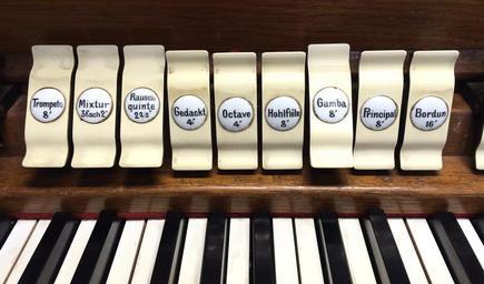 Keywords: Registerwippen der Germershäuser Orgel (Hauptwerk).JPG de Registerwippen der Germershäuser Orgel Hauptwerk own Yannick Bode Cc-zero St Mariae Verkündigung Germershausen Pipe organs in Landkreis Göttingen Organ stops