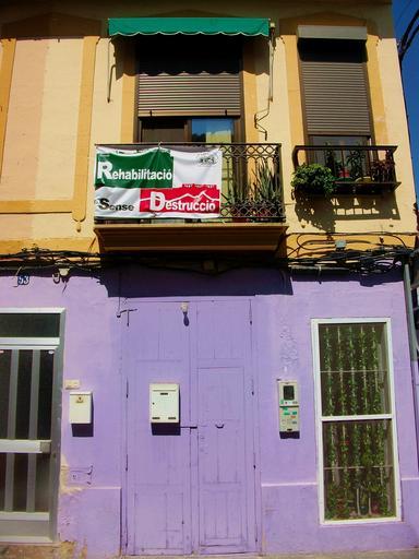 Keywords: Rehabilitació sense destrucció, Cabanyal.JPG ca Pancarta penjada a un balcó del Cabanyal diu Rehabilitació sense destrucció own Joanbanjo 2010-06 Cabanyal-Canyamelar