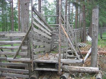 Keywords: Reindeer fences.JPG Reindeer gathering fences in Kälväsvaara's reindeer gathering area in Marttisjärvi Juorkuna Utajärvi Finland own 2007-07-19 SeppVei Utajärvi Fences in Finland Wooden fences Deer control fences July 2007 in Finland