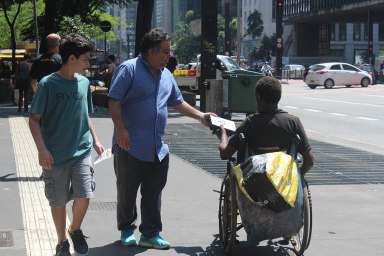 | Keywords: Relação de Poder no Brasil.jpg pt-br Morador de rua recebendo comida de alguém que passava pela calçada Fotografia tirada na esquina da Avenida Paulista com a Alameda Casa Branca em 19 de março de 2016 own Marina Arena 19 de março de 2016 Projeto Commons da Faculdade Cásper Líbero RTVI/2016 Desigualdade Social Pobreza |