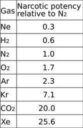 | Keywords: Relative narcotic potency.svg en A table of relative narcotic potentials for some components of breathing gases Created in MSWord captured with PaintShopPro Values found in Bennett Peter B ; Elliott David Hallen The Physiology and Medicine of Diving 5th Ed p 304; 4th Ed p 176 Relative_narcotic_potency png 2009-07-01 23 00 UTC Relative_narcotic_potency png RexxS derivative work RexxS <span class signature-talk >talk</span> Remade as svg using Inkscape RexxS Relative_narcotic_potency png Physiology |