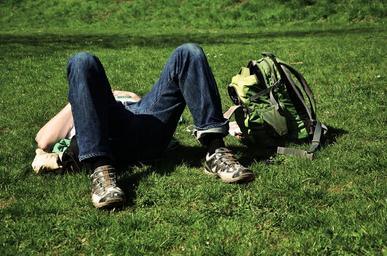 Keywords: relax rest break meadow green relaxation concerns grass sleep doze recovery shoes backpack nature human man