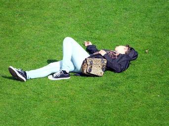 Keywords: relaxing girl woman femme sleeping female grass handbag young youth adult glamour slim person body human teenage shoes lawn lying resting