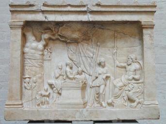 | Keywords: Relief rural votive place - 206 - Glyptothek Munich - DSC07363.jpg Weihrelief mit ländlicher Kultstätte Thronender Gott und Göttin heilige Platane Pfeiler mit kleinen Statuen des Götterpaars Altar und eine opfernde Familie Um 200 v Chr Rural votive place on a relief God and goddess on throne sacred platane column with little statues of the god pairs altar and an offering family Ca 200 BC Lieu de culte rural sur un relief votif Dieu et déesse sur un trône platane sacré colonne supportant une statue du couple divin autel et famille faisant une offrande V 200 av J -C H 62 cm Museum Glyptothek Munich Room 2 Saal des Faun object history credit line Acquired in Greece in 1882 accession number Inv 206 Daderot own 2011-05-01 other versions cc-zero Hellenistic sculptures in the Glyptothek Munich Religion in ancient Greece Glyptothek Munich - Room 2 |