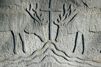 Keywords: relief stone symbol nature wild hirsch antler water source animal cross