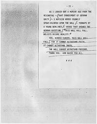 | Keywords: june today's document todaysdocument u.s. national archives usnationalarchives nara:arcid=198491 brandenberg gate brandenberggate berlin germany 1987 president reagan presidentreagan presidential speech presidentialspeech blackandwhite monochrome text black and white Title: Remarks at Brandenberg Gate, Berlin, Germany [President's Speaking Copy], 06/12/1987 Creator(s): President (1981-1989 : Reagan). White House Office of Records Management. (01/20/1981 - 01/20/1989) Persistent URL: arcweb.archives.gov/arc/action/ExternalIdSearch?id=198491 Access Restrictions: Unrestricted Use Restrictions: Unrestricted Title: Remarks at Brandenberg Gate, Berlin, Germany [President's Speaking Copy], 06/12/1987 Creator(s): President (1981-1989 : Reagan). White House Office of Records Management. (01/20/1981 - 01/20/1989) Persistent URL: arcweb.archives.gov/arc/action/ExternalIdSearch?id=198491 Access Restrictions: Unrestricted Use Restrictions: Unrestricted |