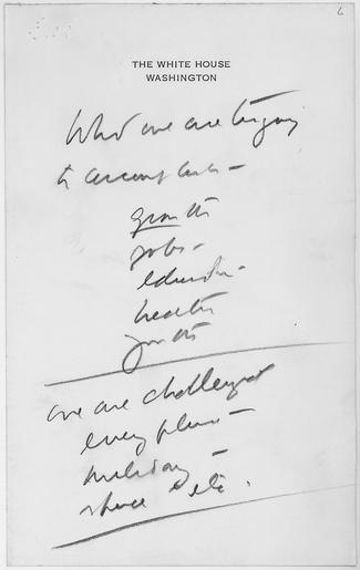 | Keywords: Reminder Notes, Things to Do January 21, 1963 - NARA - 192812.tif Scope and content Notes of the President mostly on Foreign Policy matters General notes 192812 Local identifier Kennedy John F John Fitzgerald 1917-1963 NARA-Place Africa 4179013 <br /> Canada North and Central America nation 4188341 60 -96 <br /> Europe 3136488 <br /> France Europe nation 3136736 46 2 <br /> Italy Europe nation 3136808 42 833 12 833 <br /> Japan Asia nation 3137128 36 138 <br /> Turkey Asia nation 3137413 39 35 <br /> John F Kennedy Library NLJFK Columbia Point Boston MA 02125-3398 1963-01-21 Record group Collection JFK-JFKPP John F Kennedy Personal Papers 1917 - 1963 Record group ARC 1158 John F Kennedy Personal Papers Doodles compiled 1952 - 11/22/1963 Series ARC 192764 File unit John F Kennedy Personal Papers Doodles 1963; KP1 - KP7 01/01/1963 - 01/22/1963 File unit ARC 192811 Variant control numbers NAIL Control Number NLK-JFKPP-DOODLES-1963KP1TOKP7-1963KP6NOTES yes Other versions NARA-cooperation PD-USGov Documents related to John F Kennedy To do lists |