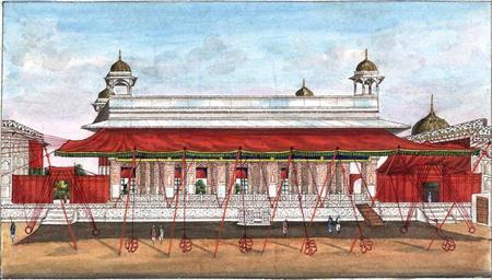 | Keywords: Reminiscences of Imperial Delhi The Diwan-i Khass from the west.png The Dewan-e-Khafs or Audience Hall for the Nobility was constructed by the Emperor Shah Juhan by whom the Royal Palace was also built It is situated at the upper end of a spacious Square elevated upon a Terrace of white Marble about four Feet in height The Dewan-e-Khafs in former times was adorned with Excessive Magnificence and though plundered by Nadir Shah the King of Persia during his invasion in 1738/9 and subsequently mutilated by the Barbarous Hordes of Mahrattas during the later end of the past and beginning of the present Century still retains sufficient Beauty to render it the object of Admiration The dimensions are said to be 150 feet in length by 40 in breadth The roof is flat supported by numerous Columns of white Marble richly ornamented with inlaid flower Work of different coloured Stones chiefly Cornelian The Cornices and Borders being decorated with Frieze and Sculptured work The Cieling sic was formerly incrusted with a rich Foliage of Gold and Silver Work throughout its whole Extent This during the Period of Anarchy was removed and an imitation Ceiling which still exists substituted In the interior of the Building and in the Cornice are the following lines written in the Persian Character in letters of Gold In Persian agar firdaus bar rui zamin ast hamin ast va hamin ast va hamin ast Ugur Firdoce bur Rooe Zumeen ust Humeen usto Humeen usto Humeen ust If there be a Paradise upon Earth It is this It is this It is this The Diwan-i Khass from the west with canopies and screens The Red Fort was commissioned by Shah Jahan r 1627-58 in 1639 it took nine years to build and was the seat of the Mughal power until 1857 when Bahadur Shah Zafar the last Mughal emperor was dethroned and exiled Part of the palace complex the Diwan-i-Khas or Hall of Private Audience was where the emperor would consult with his advisors and meet important visitors The hall was built entirely of white marble inlaid with precious stones The hall ™s ceiling was once silver which was removed by the Marathas and the spectacular Peacock throne was taken by Nadir Shah of Persia in 1739 Inscribed naqsha-i divan-i khass andarun-i qil ˜a-i shahjahanabad Mazhar ˜Ali Khan The interior of the Diwan-i Khass with qanats concealing the Khwabgah and the Scales of Justice Inscribed naqsha-i andarun-i divan-i khass dar qil ˜a-i shahjahanabad taraf-i shamal hast ˜amal-i Mazhar ˜Ali Khan From 'Reminiscences of Imperial Delhi ™ an album consisting of 89 folios containing approximately 130 paintings of views of the Mughal and pre-Mughal monuments of Delhi as well as other contemporary material with an accompanying manuscript text written by Sir Thomas Theophilus Metcalfe 1795-1853 the Governor-General ™s Agent at the imperial court Acquired with the assistance of the Heritage Lottery Fund and of the National Art-Collections Fund http //www bl uk/onlinegallery/onlineex/apac/addorimss/t/019addor0005475u00021vrb html 1843 creator Thomas Theophilus Metcalfe PD-old-100 Diwan-i-Khas Red Fort Red Fort in art Reminiscences of Imperial Delhi Thomas Theophilus Metcalfe |