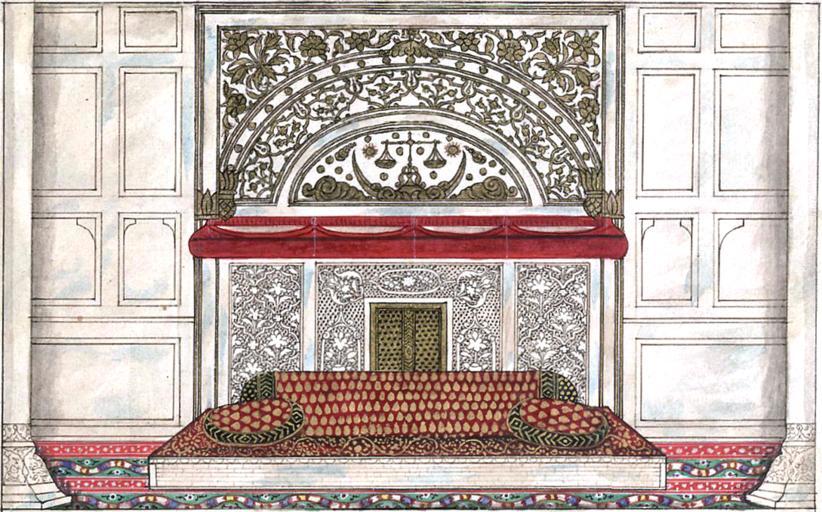 | Keywords: Reminiscences of Imperial Delhi The Emperor’s throne beneath Shah Jahan’s Scales of Justice.png en The Tusbeeh Khana or Oratory is situated to the south of the Hall of Audience and immediately connected with the Female Apartments It is now commonly used for the more private Durbars or Levees but originally from the scales and the sword blades the emblems of justice it was evidently appropriated to purposes of higher import These symbols are by no means of oriental character and they consequently confirm the belief that the Royal Palaces at Dehly and Agra were designed and superintended by European architects The small gilt wicket seen in the 2nd of the two drawings and which represents the interior of the Tusbeeh Khana was constructed in the days of anarchy and distrust and for the purpose of communication to the Emperor any secret intelligence of great moments and at the same time of protecting him from any sudden surprize on his own person The seat in front is the one now in use but the pillows are sadly executed The long round one supports the back and the two smaller ones the knees His Majesty be it remembered is accustomed to sit with his legs crossed before him It was in this building and on this throne that his present Majesty was installed at midnight of the 23rd September 1837 The guard of honor on duty on that occasion was commanded by Captain now Major Thompson C B the distinguished Officer of Engineers who blew open the gate of the Fortress of Ghuznee when attacked by the British Army in 1839 and thereby paved the way for the successful issue of our first campaign in Afganistan The Tasbih Khana or Emperor ™s private quarters viewed from the north The Tasbih Khanna is part of the Khas Mahal or the private palace of the Mughal Emperor within the Red Fort It consists of three rooms facing the Diwan-i-Khas and was used for private worship by the emperor On the northern marble screen is a representation of the scales of justice which are suspended over a crescent with the stars and sky surrounded by floral ornamentation Inscribed naqsha-i ˜aqab-i tasbih khana dar divan-i khass ˜amal-i Mazhar ˜Ali Khan The Emperor ™s throne beneath Shah Jahan ™s Scales of Justice in the Tasbih Khana Inscribed naqsha-i andarun-i tasbih khana ¦ divan-i khass ˜amal-i Mazhar ˜Ali Khan From 'Reminiscences of Imperial Delhi ™ an album consisting of 89 folios containing approximately 130 paintings of views of the Mughal and pre-Mughal monuments of Delhi as well as other contemporary material with an accompanying manuscript text written by Sir Thomas Theophilus Metcalfe 1795-1853 the Governor-General ™s Agent at the imperial court Acquired with the assistance of the Heritage Lottery Fund and of the National Art-Collections Fund 1843 http //www bl uk/onlinegallery/onlineex/apac/addorimss/e/019addor0005475u00029vrb html creator Thomas Theophilus Metcalfe Custom license marker 2013 12 26 PD-old-100 Red Fort in art Reminiscences of Imperial Delhi Khas Mahal Red Fort Thomas Theophilus Metcalfe |