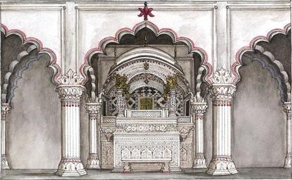 | Keywords: Reminiscences of Imperial Delhi The imperial jharoka in the Diwan-i ‘Am.png s of persons It is situated at the upper end of a spacious square and though at present much neglected is still a noble building The length is 196 feet and breadth 64 feet The roof is supported by a succession of flat arches of red stone on pillars of the same material but now disfigured by the bad taste of modern times with a coating of white plaster On each side of the Hall and all round the square are arcades which are said in former days of splendor to have been adorned with the richest tapestry But in these degenerate times the walls are bare and the buildings themselves used as stables or lumber rooms In the interior of the Dewn e Aum is a massive marble throne handsomely carved and below it a large slab of the same material on which on public days the chief ministers took their stand and handed up petitions to the Emperor This slab was beautifully inlaid with mosaic work all of which has been removed In a recess in the rear of the throne is a gilt doorway through which the Emperor entered The recess is ornamented with mosaic work of the most exquisite workmanship and of which several specimens will be found in the succeeding pages The Dewan e Aum is now never appropriated to its original purposes and indeed is nothing more than a receptacle for all kinds of rubbish Shame to the Ruling Power whether it be the King as immediate or the British Government as Lord Paramount The Diwan-i ˜Am from the west The Diwan-i 'Am is a large pavilion at the centre of the Red Fort for public imperial audiences It is positioned between the public and private parts of the fortress It faces a large open courtyard and behind the back wall lie the private imperial palaces Inscribed naqsha-i divan-i ˜amm andarun-i qil ˜a-i shahjahanabad ˜amal-i Mazhar ˜Ali Khan Closer view of the imperial jharoka in the Diwan-i ˜Am The ornate canopied throne-balcony for the emperor stands at the centre of the back wall It is entirely made of white marble carved and inlayed with precious stones in pietra dura Panels of pietra dura work depicting birds and flowers decorate the wall behind the throne some of these were imported from Italy Inscribed naqsha-i kursi andarun-i divan-i ˜amm ast ˜amal-i Mazhar ˜Ali Khan From 'Reminiscences of Imperial Delhi ™ an album consisting of 89 folios containing approximately 130 paintings of views of the Mughal and pre-Mughal monuments of Delhi as well as other contemporary material with an accompanying manuscript text written by Sir Thomas Theophilus Metcalfe 1795-1853 the Governor-General ™s Agent at the imperial court Acquired with the assistance of the Heritage Lottery Fund and of the National Art-Collections Fund http //www bl uk/onlinegallery/onlineex/apac/addorimss/t/019addor0005475u00036vrb html 1843 creator Thomas Theophilus Metcalfe 100px PD-old-100 Diwan-i-Am Red Fort Red Fort in art Reminiscences of Imperial Delhi Thomas Theophilus Metcalfe |