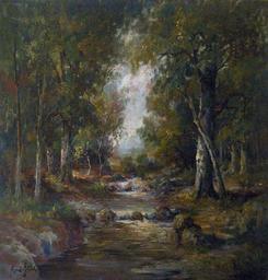 Keywords: René Stevens 001.jpg en River in a forest oil painting on canvas by René Stevens 1858-1937 ; private collection own -photo made at an art auction in Belgium JoJan - artwork by René Stevens 2009-11-29 cc-by-3 0 PD-Old René Stevens
