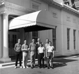 Keywords: u.s. national archives usnationalarchives jfk presidential library jfkpresidentiallibrary blackandwhite monochrome black and white Original Caption: Representative Ken Hechler (West Virginia) Poses with Guests at the White House We are looking for your help in identifying unknown people in our White House Photographs collection. If you have any information about this photograph, please post a comment, including any relevant sources, for the catalogers at the John F. Kennedy Presidential Library. Thank you! Local Identifier: JFKWHP-KN-22187 Created By: President (1961-1963 : Kennedy). Office of the Naval Aide to the President.(1961 - 1963) From: Collection JFK-WHP: White House Photographs, 12/19/1960 - 03/11/1964 Contact: John F. Kennedy Library (LP-JFK), Columbia Point Boston, MA 02125-3398 Phone: 617-514-1600 Fax: 617-514-1652 Email: kennedy.library@nara.gov Production Dates: 6/9/1962 Scope and Content Note: In this photograph, Representative Ken Hechler of West Virginia (center) poses with unidentified guests at the West Wing Entrance, White House, Washington, D.C. Persistent URL: JFK Library URL: www.jfklibrary.org/Asset-Viewer/Archives/JFKWHP-KN-22187.aspx.... Access Restrictions: Unrestricted Use Restrictions: Unrestricted Original Caption: Representative Ken Hechler (West Virginia) Poses with Guests at the White House We are looking for your help in identifying unknown people in our White House Photographs collection. If you have any information about this photograph, please post a comment, including any relevant sources, for the catalogers at the John F. Kennedy Presidential Library. Thank you! Local Identifier: JFKWHP-KN-22187 Created By: President (1961-1963 : Kennedy). Office of the Naval Aide to the President.(1961 - 1963) From: Collection JFK-WHP: White House Photographs, 12/19/1960 - 03/11/1964 Contact: John F. Kennedy Library (LP-JFK), Columbia Point Boston, MA 02125-3398 Phone: 617-514-1600 Fax: 617-514-1652 Email: kennedy.library@nara.gov Production Dates: 6/9/1962 Scope and Content Note: In this photograph, Representative Ken Hechler of West Virginia (center) poses with unidentified guests at the West Wing Entrance, White House, Washington, D.C. Persistent URL: JFK Library URL: www.jfklibrary.org/Asset-Viewer/Archives/JFKWHP-KN-22187.aspx.... Access Restrictions: Unrestricted Use Restrictions: Unrestricted