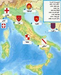 | Keywords: Repubbliche marinare in arabo.jpg en Map of the Maritime Republics in Arabic it Mappa delle repubbliche marinare con didascalie in Arabo Ho fatto io la carta usando come base una mappa tratta da Commons Sono io l'autore 2012-08-20 Amalfi Genova Pisa Venezia Ancona Gaeta Noli Ragusa Croazia Rome Venice Dubrovnik Genoa Cc-zero Maps of Europe |