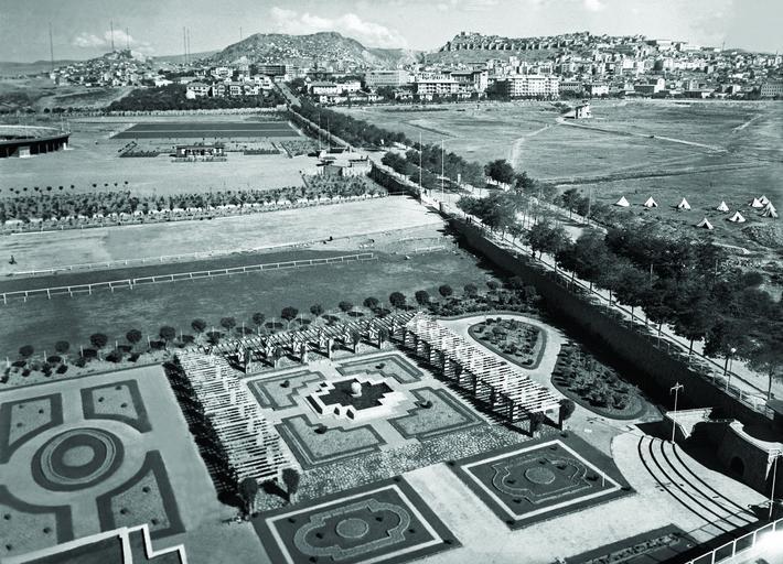 | Keywords: outdoor monochrome On this photo, one can see the road which heads to the central city from Ankara Railway Station. The tents shown on the photo must have belonged to the workers of Culture Park (Youth Park). The Shooting Gallery which was constructed for promoting and popularizing shooting on 1930s cannot be seen on the photo. However, the beauty of its garden is unveiled on these photos. Cumhuriyet Bulvarı, Atış Poligonu Bahçesi, 1938 Osmanlı döneminde ve Cumhuriyet’in ilanından sonraki yılların başında, Ankara Garı’ndan çıkıldığında, kente, Taşhan Meydanı’na iki tarafı bataklık toprak bir yoldan gitmek zorundaydınız. Başkent Ankara yönetiminin ilk önemli hizmetlerden biri, çevreye hastalık yayan bataklığı kurutmak oldu. Toprak yol asfaltlandı, hat boyunca ağaçlandırıldı. Yolun sağına soluna, kente, Taşhan’a kadar spor, eğlence, dinlenme tesisleri yapılması düşünülüyordu. Bu fotoğrafta ise çadırlar görülüyor. Çadırlar, Kültür Parkı’nın (Gençlik Parkı) yapılacağı alan içerisinde ve parkın yapımında çalışanlara ait olmalı. 1930’larda atıcılık sporunun gelişmesi, yaygınlaştırılması amacıyla yaptırılan Atış Poligonu’nun görülmüyor. Ama bahçesi bütün güzelliğiyle gözler önünde. On this photo, one can see the road which heads to the central city from Ankara Railway Station. The tents shown on the photo must have belonged to the workers of Culture Park (Youth Park). The Shooting Gallery which was constructed for promoting and popularizing shooting on 1930s cannot be seen on the photo. However, the beauty of its garden is unveiled on these photos. Cumhuriyet Bulvarı, Atış Poligonu Bahçesi, 1938 Osmanlı döneminde ve Cumhuriyet’in ilanından sonraki yılların başında, Ankara Garı’ndan çıkıldığında, kente, Taşhan Meydanı’na iki tarafı bataklık toprak bir yoldan gitmek zorundaydınız. Başkent Ankara yönetiminin ilk önemli hizmetlerden biri, çevreye hastalık yayan bataklığı kurutmak oldu. Toprak yol asfaltlandı, hat boyunca ağaçlandırıldı. Yolun sağına soluna, kente, Taşhan’a kadar spor, eğlence, dinlenme tesisleri yapılması düşünülüyordu. Bu fotoğrafta ise çadırlar görülüyor. Çadırlar, Kültür Parkı’nın (Gençlik Parkı) yapılacağı alan içerisinde ve parkın yapımında çalışanlara ait olmalı. 1930’larda atıcılık sporunun gelişmesi, yaygınlaştırılması amacıyla yaptırılan Atış Poligonu’nun görülmüyor. Ama bahçesi bütün güzelliğiyle gözler önünde. |