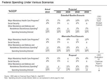 | Keywords: Republican Proposal - Federal Spending as percent GDP.png Federal spending as GDP under CBO and Ryan Scenarios<br/> Understanding the Chart The CBO provided an analysis to Chairman Paul Ryan of the House Committee on the Budget of his budget proposal in April 2011 <ref>http //www cbo gov/ftpdocs/121xx/doc12128/04-05-Ryan_Letter pdf CBO-Ryan Letter-April 2011</ref> The chart captions are listed below excerpted directly from the letter Notes The proposal that CBO analyzed is as specified by Chairman Paul Ryan and his staff The extended-baseline and alternative fiscal scenarios are as described in Congressional Budget Office The Long-Term Budget Outlook June 2010; revised August 2010 Components may not add up to totals because of rounding a Includes Medicare Medicaid exchange subsidies and the Children's Health Insurance Program CHIP b Incorporates collections of premiums paid by Medicare beneficiaries c Includes Medicare and Medicaid as structured under the proposal and CHIP There are no exchange subsidies under the proposal The National Commission on Fiscal Responsibility and Reform separately described the CBO long-term scenarios as listed below The Extended-Baseline Scenario generally assumes continuation of current law The Alternative Fiscal Scenario incorporates several changes to current law considered likely to happen including the renewal of the 2001/2003 tax cuts on income below 250 000 per year continued Alternative Minimum Tax AMT patches the continuation of the estate tax at 2009 levels and continued Medicare Doc Fixes The Alternative Fiscal Scenario also assumes discretionary spending grows with Gross Domestic Product GDP rather than to inflation over the next decade that revenue does not increase as a percent of GDP after 2020 and that certain cost-reducing measures in the health reform legislation are unsuccessful in slowing cost growth after 2020 <ref>http //www fiscalcommission gov/sites/fiscalcommission gov/files/documents/TheMomentofTruth12_1_2010 pdf National Commission on Fiscal Responsibility and Reform-Final Report-December 2010</ref> http //www cbo gov/ftpdocs/121xx/doc12128/04-05-Ryan_Letter pdf CBO-Ryan Letter Farcaster talk 00 26 11 April 2011 UTC Reflist PD-USGov Original upload log en wikipedia Republican+Proposal+-+Federal+Spending+as+percent+GDP png wikitable - 2011-04-11 00 39 960×720× 182269 bytes Farcaster ' - 2011-04-11 00 26 960×720× 182269 bytes Farcaster Federal spending as GDP under CBO and Ryan Scenarios http //www cbo gov/ftpdocs/121xx/doc12128/04-05-Ryan_Letter pdf CBO-Ryan Letter ~~~~~ ~~~~ Permission Uncategorized 2016 May 6 |