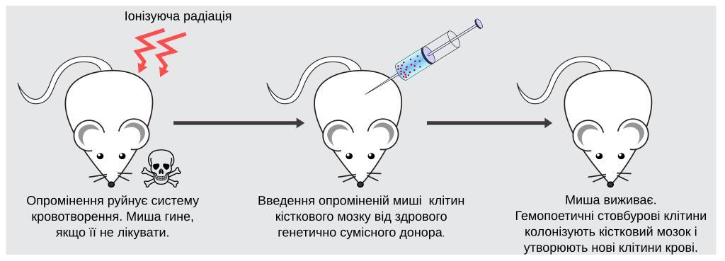 | Keywords: Rescue of irradiated mouse.svg uk Схема досліду у якому миші уйнують систему к овотво ення шляхом оп омінення летальною дозою іонізуючої адіації Життєздатність миші відновлюється після пе есадки клітин кісткового мозку від генетично сумісного доно а 8/06/2011 own Zlir'a cc-zero Uploaded with UploadWizard Hematopoiesis |