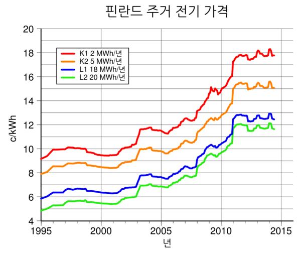 Keywords: Residential Electricity Price in Finland-ko.svg en Residential electricity price in Finland from 1995 to 2014 Data from http //193 166 171 75/Dialog/varval asp ma 050_ehi_tau_105_en ti Price+of+Electricity+by+Type+of+Consumer 2C+c 2FkWh+ 28Prices+include+electrical+energy 2C+distribution+of+electricity 2C+and+taxes 2E 29 path /Database/StatFin/ene/ehi/ lang 1 multilang en Statistics Finland K1 Apartment house no electric sauna stove consumption 2 000 kWh/a fuse 1x25 A K2 Detached house electric sauna stove no electric heating 5 000 kWh/a 3x25 A L1 Detached house direct electric heating 18 000 kWh/a 3x25 A L2 Detached house partly accumulating electric heating 20 000 kWh/a 3x25 A 2014-11-22 File Residential Electricity Price in Finland-en svg Delphi234 other versions cc-zero Electricity prices Electricity in Finland Uploaded with UploadWizard