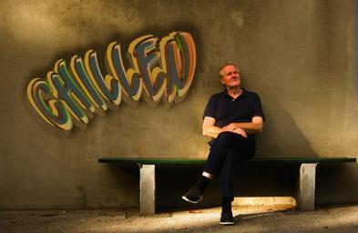 Keywords: rest bank chill out relax relaxation lazing around holidays mess graffiti man rum gammeln wall