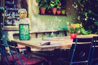 Keywords: restaurant café guesthouse table chairs menu rustic bistro diner outside gastronomy chef food magazine plants flowers green cozy