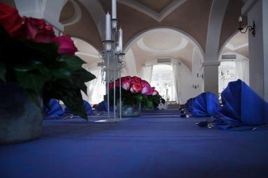 Keywords: restaurant table covered take out tablecloth blue floral decorations roses candlestick napkins cutlery vault stucco old antique window curtain eat gastronomy board inn celebration gedeckter table eating out