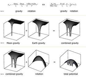 | Keywords: Restricted Three-Body Problem - Energy Potential Analysis.png Force Field-Gravity Well Inter-relationship png Note 1 Half of the field has been cut away for clarity Also the mass parameter mu being graphed is 0 25 This is a significant difference from the Earth-Moon system so the labels are only qualitatively representative There are also Coriolis effects which are dynamic and not shown Many science museums have gravity well demonstrations A similar display can be created for three-body orbits by using a 3-d printer to make the combined gravity potential surface and then rotating it at a scaled rate A steel ball bearing could then be placed at the stable L4 or L5 locations equilateral to the primary masses and if the model is properly constructed then these ball bearings will stay in place until air resistance drags them away The centrifugal and Coriolis effects are simply manifestations of inertial effects when observed from the rotating reference frame Note 2 Because the rotation rate of the primary masses is a function of gravity it should be understood that the labeling of factors as being due to gravity and due to rotation does not mean that the latter has nothing to do with the former This should be clear upon inspection of both equations If these labels were not distilled down to a single word for the sake of simplicity the long-hand labels could be potential due to the force due to gravity gravity and potential due to the force due to the rotation due to the force due to gravity rotation Graphics generated by HiQ PDF image edited with GIMP and MS Paint http //preview tinyurl dot com/Thesis-EnergyPotentialAnalysis - Figures 4 3 4 4 and Equations 4 8 4 16 on pdf pgs45 through 49 of 64 Invent2HelpAll 2013-04-07 Cc-zero Gravitational potential Three-body problem Potential wells Potential energy |