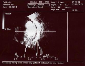 Keywords: Retinoblastoma ultrasound.jpg An ocular ultrasound of a large retinoblastoma tumor within the eye of a three year old boy Scanned image of ulatrasound printout 2/27/06 Natebw N/A Ultrasound images of eyes Retinoblastoma