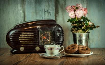 Keywords: retro radio old cup historical still life flower coffee yellowed food breakfast hot vintage background