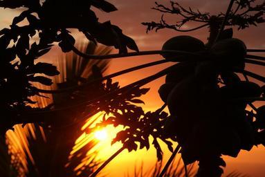 Keywords: reunion island sunset evening inflamed sun ocean sea sky side leaves holiday silhouette summer nature yellow orange light papaya