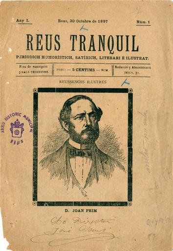Keywords: Reus Tranquil.jpg ca Primera pàgina del núm 1 de Reus Tranquil Exemplar de la Biblioteca Central Xavier Amorós de Reus Magenri 30-X-1897 PD-old-100 Premsa històrica de Reus PD-old-100