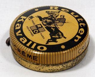 | Keywords: Reutter Kavallo Horse Shoe Polish Tin 1930s picture 2.JPG Very old packaging of a Dutch product that is not produced and not sold any more Photographed at a collector of Droste For info see http //www tincollectors nl/ tincollectors nl or email info tincollectors nl own 2014-06-15 11 19 40 Alf van Beem CC-Zero Trademarked Shoe polish tins |