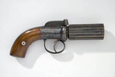 | Keywords: Revolver, pepperbox - Livrustkammaren - 56786.jpg Pipknippe av gråanlöpt stål med sex lopp rundade utsidor Mellan loppen skålade fält vid bakänden inslaget kontrollstämplar i skålningarna omväxlande Birmingham proof och view Stöckel no 1310-1311 Därbakom inskruvat vinkelrätt mot loppen sex tändhattsnipplar delvis täckta av stålbottnens skärm Vid mynningen en graverad bladbård Pipan fäst på axeln med en skruv i framänden graverad blomdekor på huvudet <br/><br/>Rund skålad stötbotten bakåt övergående i kolvram graverad rank- och sicksackdekor På höger sida lock över mekanismen På ovansidan en slagarm l 55 mm fyrsidig med graverad rankdekor på ovansidan en repstav Uppåt avsmalnande cylindriskt slaghuvud Slagfjäder typ B triangulär fot fastskruvad i kolvramens underdel blank länk mellan slagarm och avtryckare Böjd avtryckare <br/><br/>Böjd kolv oval kolvände ram med rankdekor mittpå ryggen vid kolvänden samt mitt på kolvänden Kolvplattor av valnöt skruv med brickor av silver original caption revolver pepperbox - LRK 4779<br/> Nyckelord Revolver Pepperbox Föremålsbild ca other date - 1845 1850 steel e123 - eldvapen - pipa lås och stock material stål - walnut e3 - eldvapen - stock material valnöt - silver e7 - eldvapen - stockbeslag material silver size mm 210 size mm 80 pipa size mm 85 g 680 LRK Birmingham view korsade spiror krona och V Stöckelnr 1311 anv e1 - eldvapen - pipa; anonym kontrollör Birmingham proof korsade spiror krona och P Stöckelnr 1310 anv e1 - eldvapen - pipa; anonym kontrollör place of origin Birmingham original filename lm_dig2087 41294 inventory number LRK 4779 56786 CC-BY-SA Göran Schmidt Göran Schmidt Media contributed by LSH dim-with multiple size templates Media contributed by LSH unmatched objKeyword Media contributed by LSH unmatched keyword Pepper-box Color images from Livrustkammaren Media contributed by LSH 2013-10 |