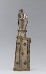 | Keywords: Rhenish - Arm Reliquary of Saint Pantaleon - Walters 57688 - Back.jpg This silver arm is known as a speaking reliquary because it takes shape of the body part it once contained The reliquary reputedly held an arm bone of Saint Pantaleon a Holy Doctor martyred in Asia Minor AD 305 who later became the patron saint of physicians The remains of an inscription along the seam of the sleeve refer to the saint by name The small door with the two glass shields was added in the 15th century as was the crystal at the edge of the sleeve Reliquary late 13th century; Additions 15th century Medieval gilded silver with rock crystal semiprecious stones glass and niello cm 47 2 12 8 9 2 accession number 57 688 25190 A Tollin Paris Chevallier Mannheim Paris May 20 1897 no 79 Robert Hoe New York American Art Association New York February 15 1911 no 1813 Wareham Harding New York Henry Walters city Baltimore Walters Art Museum Henry Walters Acquired by Henry Walters 1920 Transcription Incomplete inscription in niello on the narrow silver strip ornamenting the seam of the sleeve DE SANCTI PANTALEONIS + AVE; Translation From Pantaleon greetings A Medieval Treasury from Southern Collections Ackland Art Center University of North Carolina at Chapel Hill Chapel Hill 1961 Reliquaries and Ritual Medieval Objects of Devotion The Walters Art Gallery Baltimore 1984-1985 Treasures of Heaven The Cleveland Museum of Art Cleveland; The Walters Art Museum Baltimore; The British Museum London 2010-2011 place of origin west Germany Walters Art Museum license Arm Reliquary of Saint Pantaleon |
