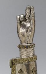 | Keywords: Rhenish - Arm Reliquary of Saint Pantaleon - Walters 57688 - Detail A.jpg This silver arm is known as a speaking reliquary because it takes shape of the body part it once contained The reliquary reputedly held an arm bone of Saint Pantaleon a Holy Doctor martyred in Asia Minor AD 305 who later became the patron saint of physicians The remains of an inscription along the seam of the sleeve refer to the saint by name The small door with the two glass shields was added in the 15th century as was the crystal at the edge of the sleeve Reliquary late 13th century; Additions 15th century Medieval gilded silver with rock crystal semiprecious stones glass and niello cm 47 2 12 8 9 2 accession number 57 688 25190 A Tollin Paris Chevallier Mannheim Paris May 20 1897 no 79 Robert Hoe New York American Art Association New York February 15 1911 no 1813 Wareham Harding New York Henry Walters city Baltimore Walters Art Museum Henry Walters Acquired by Henry Walters 1920 Transcription Incomplete inscription in niello on the narrow silver strip ornamenting the seam of the sleeve DE SANCTI PANTALEONIS + AVE; Translation From Pantaleon greetings A Medieval Treasury from Southern Collections Ackland Art Center University of North Carolina at Chapel Hill Chapel Hill 1961 Reliquaries and Ritual Medieval Objects of Devotion The Walters Art Gallery Baltimore 1984-1985 Treasures of Heaven The Cleveland Museum of Art Cleveland; The Walters Art Museum Baltimore; The British Museum London 2010-2011 place of origin west Germany Walters Art Museum license Medieval metalwork in the Walters Art Museum Rhenish paintings Media contributed by the Walters Art Museum needs category review |