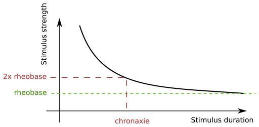 | Keywords: Rheobase chronaxie.svg en Chronaxy is the shortest duration of an electrical stimulus where the threshold amplitude is twice the rheobase - the minimum required for eliciting an ACTION POTENTIAL at any time period It is a measure of the excitability of nerve or muscle tissue and is characteristic of types and/or condition of the nerve or muscle cells in the tissue <br /> Rheobase is the minimal current amplitude of indefinite duration practically a few hundred milliseconds that results in the depolarization threshold of the cell membranes being reached i e an action potential or the contraction of a muscle 2012-09-23 22 33 18 own https //commons wikimedia org/wiki/File Rheobase_chronaxie png Sav vas cc-zero Uploaded with UploadWizard Psychiatry Psychology SVG files on nervous system |