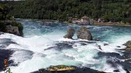 Keywords: rhine falls schaffhausen water spray enormous switzerland germany rhine river tourism destination murmur roaring water mass rock observation deck