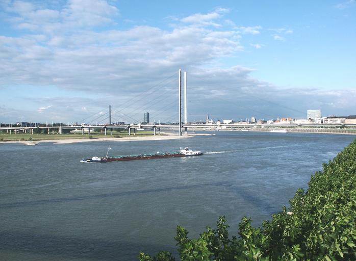 Keywords: rhine water ship suspension bridge bridge düsseldorf knee bridge architecture landscape river landscape panorama germany