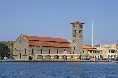 Keywords: rhodes greece cathedral church building architecture lake water shoreline sky clouds scenic outside