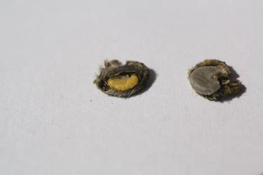 Keywords: Rhopalapion longirostre larve.JPG en Two opened hollyhock seeds Left Seed with grub inside right with seed de Zwei geöffnete Stockrosensamen Links Mit Larve rechts mit Samenkorn own MiraculixHB 2011-08-19 Cc-zero Rhopalapion longirostre