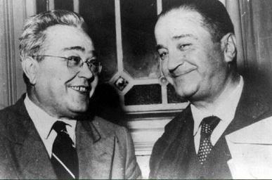 Keywords: Ricardo Balbin y Crisólogo Larralde.jpg Ricardo Balbín Crisólogo Larralde circa 1950 Instituto Nacional Yrigoyeneano ca 1950 Author No need Ley law 11723 art 34 unknown PD-AR-Photo Ricardo Balbin Black and white photographs of men