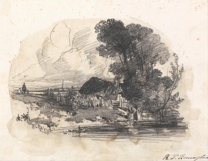 | Keywords: Richard Parkes Bonington - Trees and a Cottage by a River - Google Art Project.jpg Inscribed lower right in graphtie B ; in artist's hand in pen and black ink lower right R P Bonington ; inscribed on mount in pen and black ink lower center Sketch by the late celebrated artist Richard Parkes Bonnington Esq Drawn for Henriette A Eliot in her presence -Paris-1827-; inscribed on mount in graphite center right leave this Inscription _Signed_and_Dated Signed lower right in pen and black ink R P Bonington Not on View Black chalk and gum on medium cream smooth wove paper mounted on medium gray smooth wove paper figures cottage river trees landscape special url_id ZAHqy_TBl3KEhQ PD-old-100-1923 1828 Richard Parkes Bonington Google Art Project works by Richard Parkes Bonington |