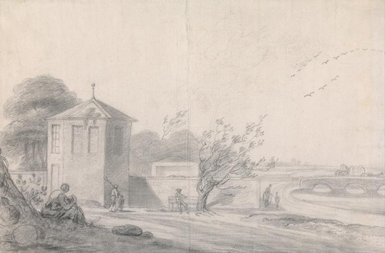 Keywords: Richard Wilson - Riverside Scene with Figures, Hexagonal Building Left and Horse-Drawn Wagon Crossing Bridge at Right - Google Art Project.jpg No inscription Inscription _Signed_and_Dated Not signed not dated Not on View Graphite and black chalk with black ink on medium moderately textured blued white laid paper birds horses animals hexagon river wagon landscape special url_id aAGSbou17jxp7Q PD-old-100-1923 1782 Richard Wilson painter Google Art Project works by Richard Wilson