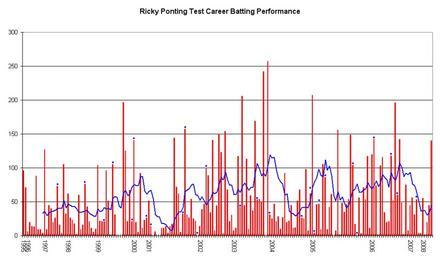 | Keywords: Ricky Ponting Graph.png Test Match performance of Ricky Ponting The red bars indicate the player's test match innings while the blue line shows the average of the ten most recent innings at that point Note that this average cannot be calculated for the first nine innings The blue dots indicate innings in which Ponting finished not-out This graph was generated with Microsoft Excel 2002 using data from Cricinfo http //stats cricinfo com/statsguru/engine/player/7133 html class 1;orderby start;template results;type batting;view innings and Howstat http //www howstat com au/cricket/Statistics/Players/PlayerProgressBat asp PlayerID 2041 The information in this chart is current as of 2 February 2008 2005-11-1 Own <br />Transferred from http //en wikipedia org en wikipedia Raven4x4x at http //en wikipedia org en wikipedia en wikipedia Raven4x4x Original upload log page en wikipedia Ricky_Ponting_Graph png 2005-11-01 09 56 Raven4x4x 963×492 7507 bytes <nowiki>This graph details the Test Match performance of Ricky Ponting The red bars indicate the player's test match innings while the blue line shows the average of the ten most recent innings at that point Note that t</nowiki> 2005-11-30 07 15 Raven4x4x 963×492 7215 bytes <nowiki>Updated info up to 30 November 2005</nowiki> 2006-01-07 08 28 Raven4x4x 963×492 7321 bytes <nowiki>Updated The information in this graph is current as of January 7 2006 </nowiki> 2006-04-24 06 39 Raven4x4x 957×539 7516 bytes <nowiki>Updated current as of 24 April 2006</nowiki> 2007-01-10 00 48 Raven4x4x 986×574 6490 bytes <nowiki>The information in this chart is current as of 10 January 2007 </nowiki> 2007-11-20 07 34 Raven4x4x 986×574 6753 bytes <nowiki>Updated The information in this chart is current as of 21 November 2007 </nowiki> 2008-02-02 07 28 Raven4x4x 986×574 6862 bytes <nowiki>Updated The information in this chart is current as of 2 February 2007 </nowiki> DEFAULTSORT Ponting Richard Cricket graphs Ricky Ponting |